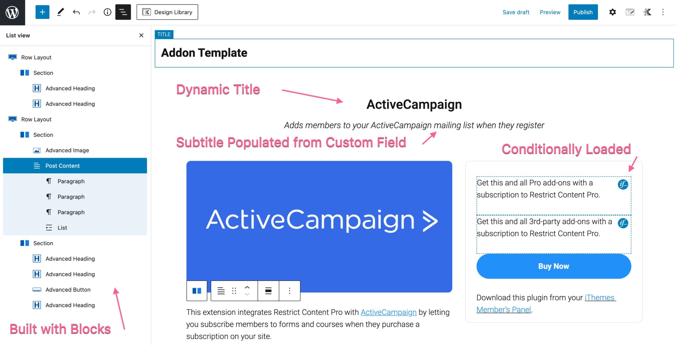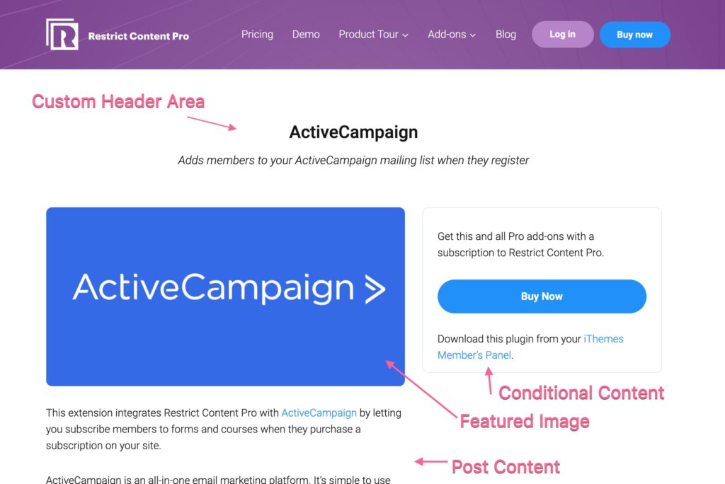 Kadence Theme w wersji PRO ma dodatek, który dodaje możliwość tworzenia szablonów i warunkowego stosowania ich w różnych obszarach witryny. Na przykład, jeśli masz niestandardowy typ posta i chcesz zaprojektować unikalny układ dla tego niestandardowego typu postu, możesz to łatwo zrobić za pomocą elementów Kadence. Nasi dobrzy przyjaciele z Restrict Content Pro wykorzystali to do skonfigurowania swoich stron z pojedynczymi dodatkami. Dodatki to niestandardowy typ postu w ich zapleczu i stosują szablon do tworzenia swojego projektu. Korzystanie z takiego szablonu pozwala im pobierać niestandardowe pola, a także treść posta, aby wypełnić stronę. Kadence Blocks Pro dodaje wszystkie dynamiczne kontrolki zawartości.