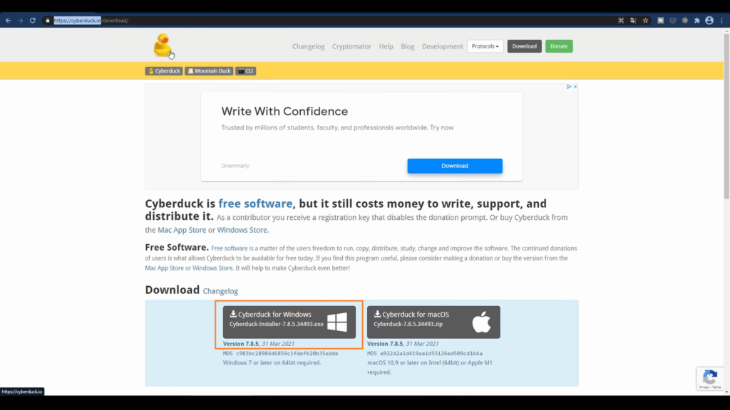 Będziemy też potrzebowali programu client FTP, ja wybrałem Cyberduck. Wpisujemy w Google: „cyberduck download” albo bezpośrednio: https://cyberduck.io/download/.