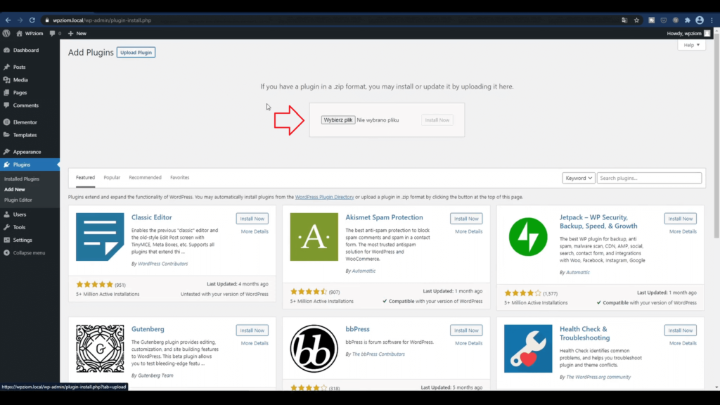 Teraz dodajemy nową wtyczkę na WordPressie. Tradycyjnie szuka się wtyczek w wyszukiwarce, jednak my mamy ją już na dysku, więc musimy ją wrzucić na serwer.