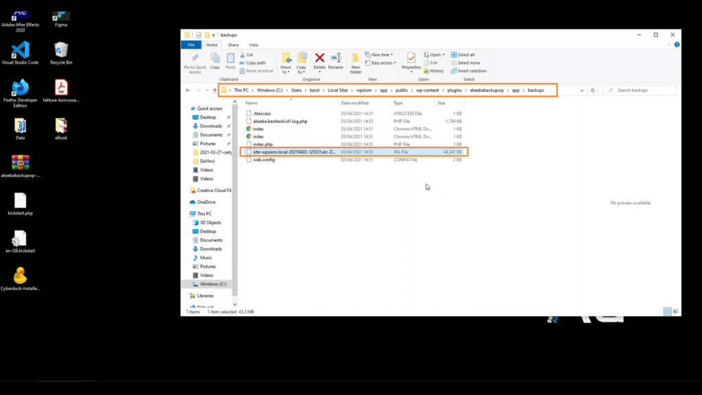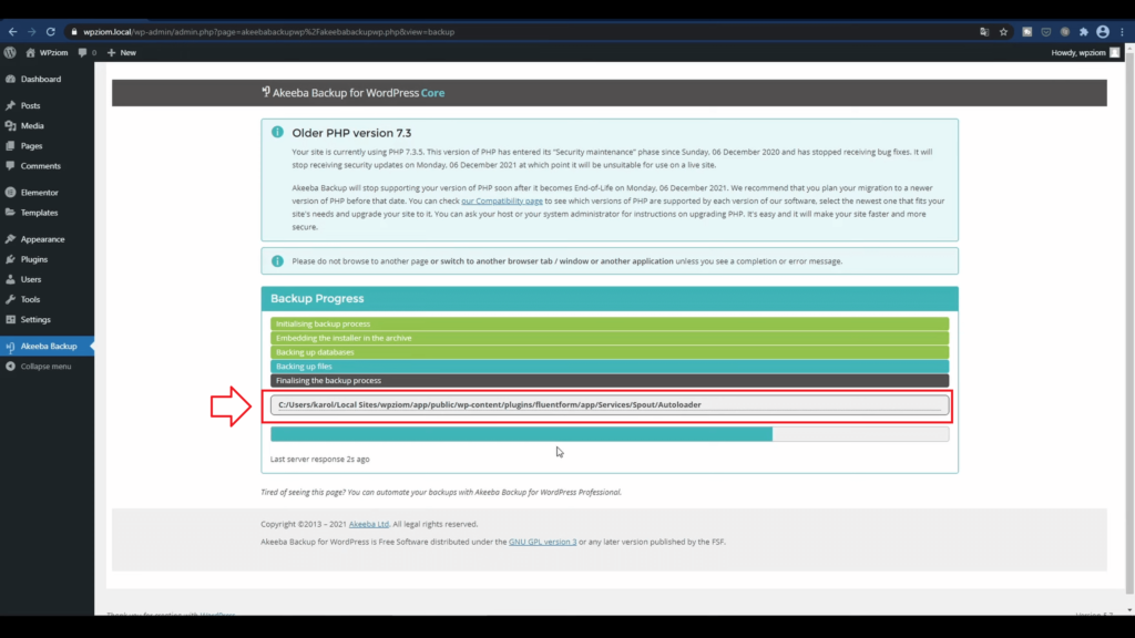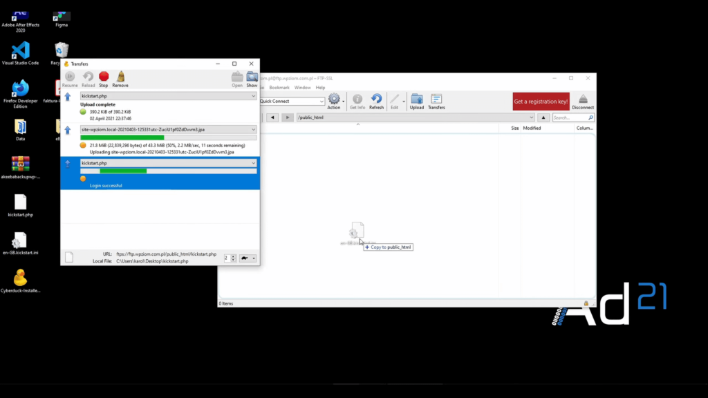 Do folderu wrzucamy także dwa pliki: kikstartphp i plik do tłumaczenia, który ściągnęliśmy jako zip. Sprawdzamy, gdzie jest nasz backup, bo będzie się najdłużej wrzucał ze względu na swoją wagę.