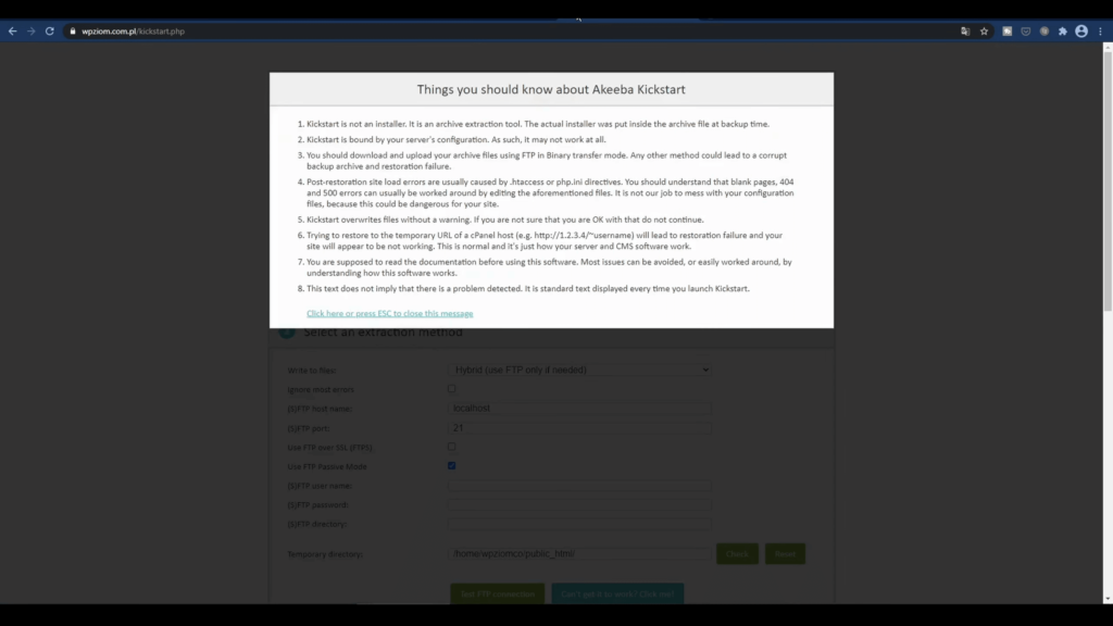 I tutaj wpisujemy sobie “/kikstart.php“. To jest plik, który przed chwilą wrzuciłem i to jest w zasadzie wszystko, żeby go odpalić. Pokazuje nam się komunikat, klikamy escape.