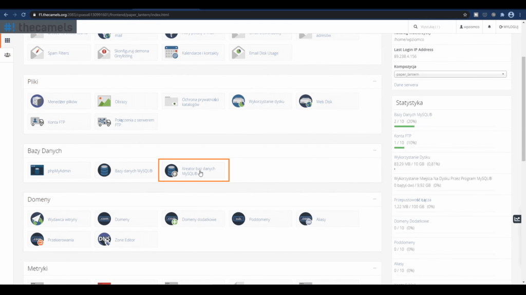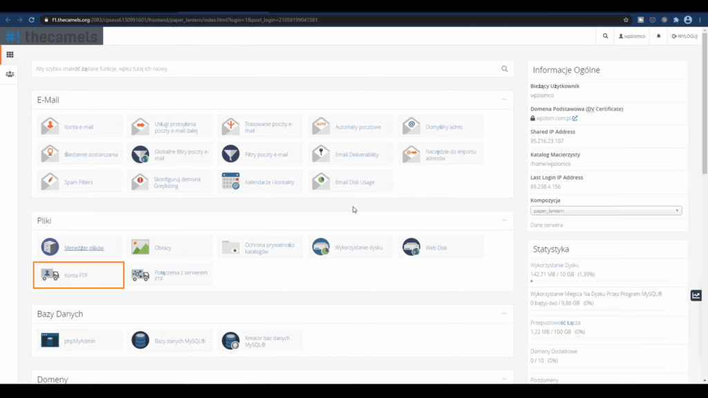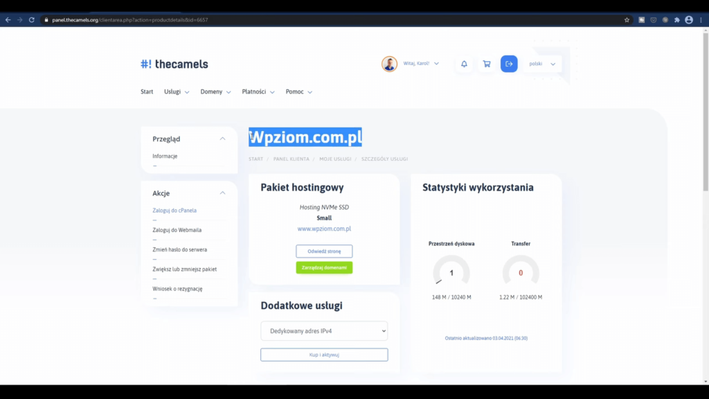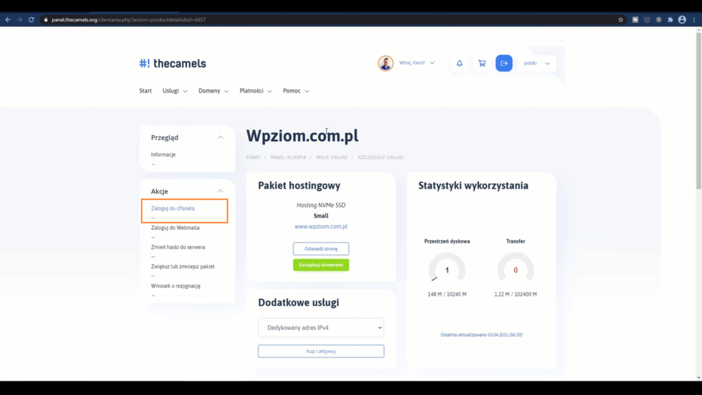 Teraz przełączymy się na serwer. Ja jestem w panelu klienta thecamels, bo tutaj instalowałem WordPress. Tutaj klikamy: “Zaloguj się do Cpanela“.