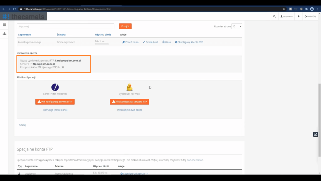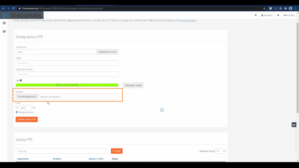 Teraz musimy utworzyć konto FTP. Więc klikamy przycisk: “Konta FTP“.