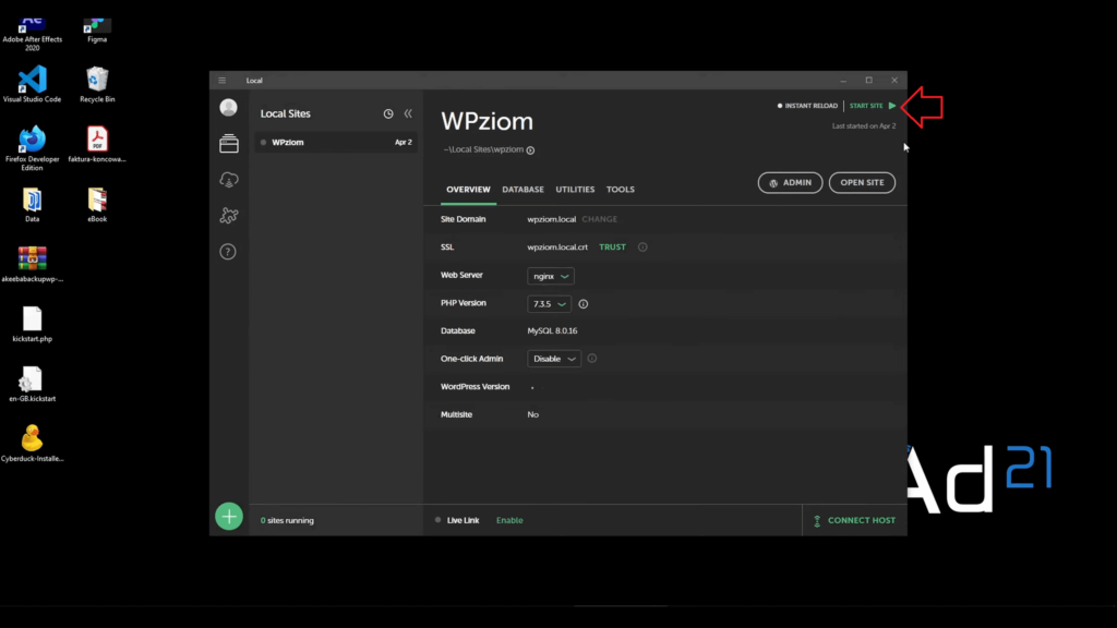Na sam początek włączymy WordPressa za pomocą localWP. Klikamy “START SITE”. Od razu też logujemy się do panelu administracyjnego. W międzyczasie możemy odpalić sobie wtyczkę do backupu.