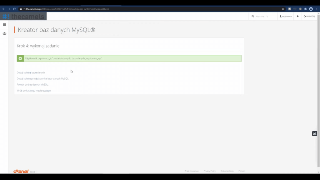 Teraz musimy utworzyć nową bazę danych, nowego użytkownika. Czyli jeśli mieliśmy złe hasło i zły prefix, to tutaj możemy wszystko stworzyć od nowa w stosunkowo bezpieczny sposób. Ja pokazywałem, jak to się robi przy instalacji WP. Pokaże jeszcze raz, ale jeśli masz bazę danych, to nie musisz tego robić (natomiast proponuję zawsze tworzyć nową bazę danych).