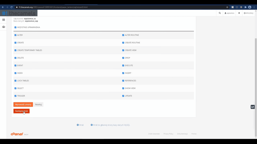 Nadajemy wszystkie uprawnienia i klikamy “Następny krok”.