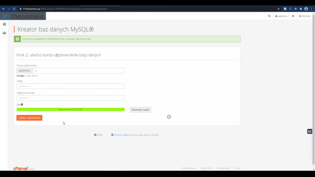 Wpisujemy nazwę użytkownika, generujemy hasło do bazy danych. Klikamy „Utwórz użytkownika”.