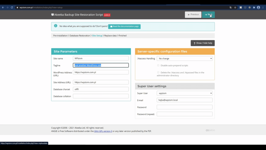 Jeśli nic nie zmienimy w „Super User settings” to mamy takie samo hasło i nazwę użytkownika jak mieliśmy przy instalacji poprzedniej. Możesz też wpisać nowe, jeśli chcesz to zmienić. Klikamy „Next”.