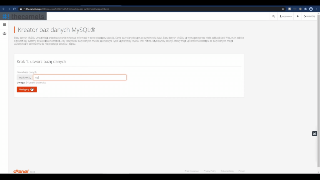 Wpisuje nazwę bazy danych i klikam “Następny krok“.