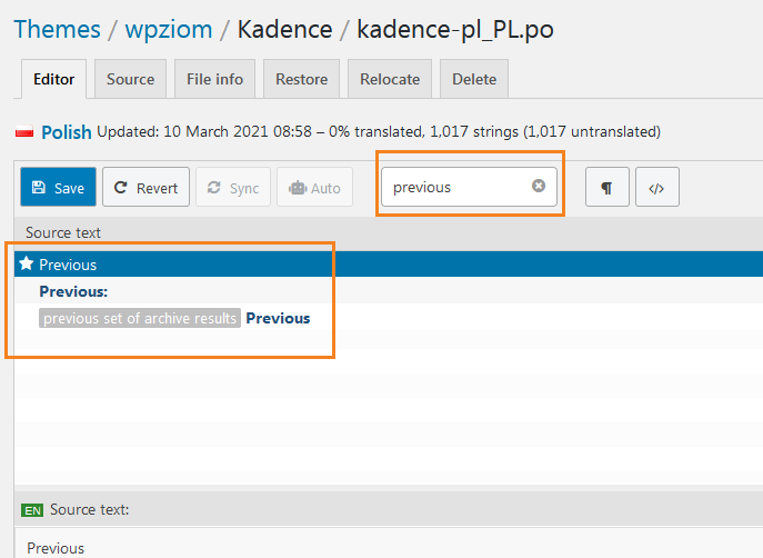Jak widać na poniższym screenie – który możesz potraktować jako omówienie zadania praktycznego – u mnie pokazały się trzy tłumaczenia “Previous”. W takiej sytuacji mogę przetłumaczyć jedno z nich i sprawdzić, czy to będzie akurat tłumaczenie do “Previous” we wpisach. Ale szybciej będzie, jak przetłumaczę wszystkie trzy.